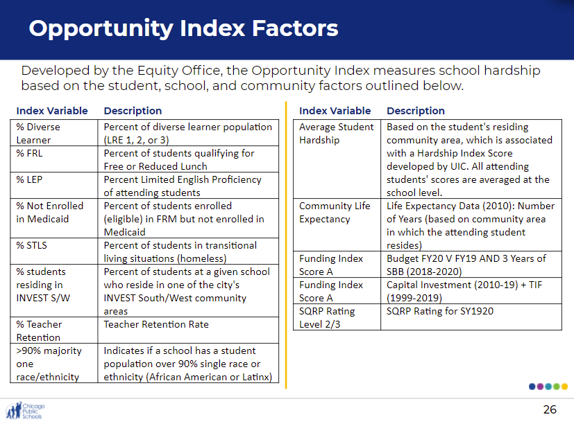 In this fiscal year, CPS started using an Opportunity Index to understand where there is the greatest student need. $26 million in equity grant funding was tied to this Opportunity Index.