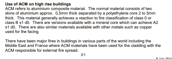 It was warned again in 2014 that this material was in wide use in the UK due to a perceived weakness in our regulations and did not even write an FAQ to make clear that it was banned. This followed a series of large fires with the same product in the Middle East.