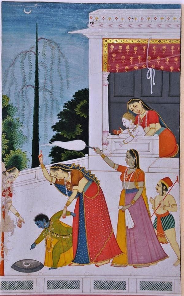 "Krishna as a Child Sees the Moon in a Bowl of Water", India, Pahari, Late 18th Century, Opaque and transparent watercolors on paper. Image