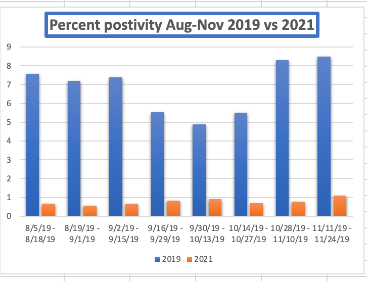 2. That number of positive #flu tests is a positivity rate of 0.78%, which is still well below what we'd expect to see at this time of the year, when flu transmission in the Northern Hemisphere normally builds. This graph (mine) compares positivity rates in autumn 2019 & 2021.