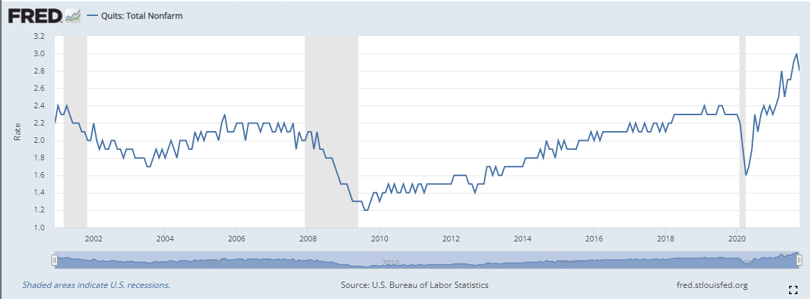 "Big picture: More people tend to quit when the economy is doing well or they think they can find a better job. That largely explains the huge increase in people leaving their jobs this year."