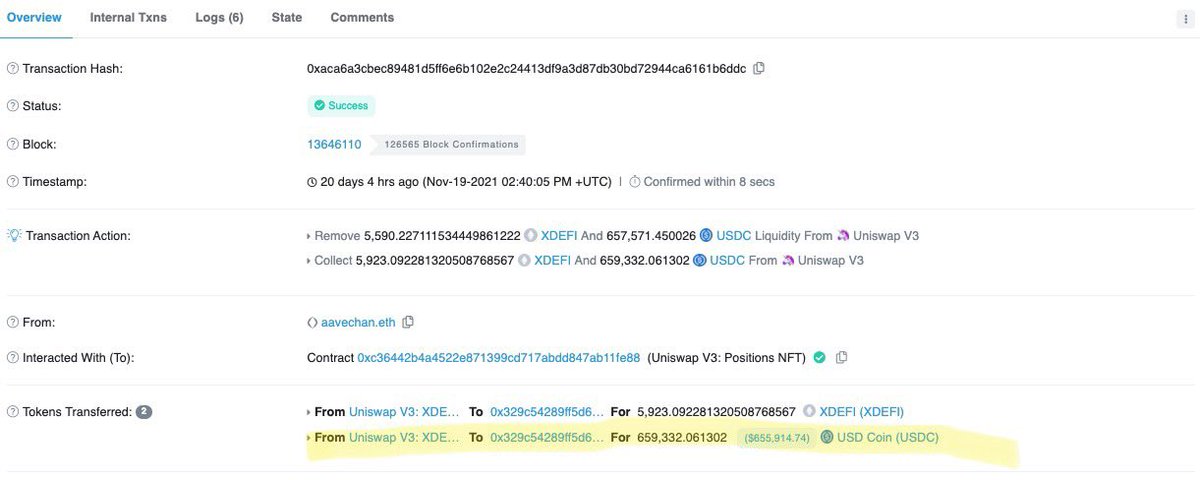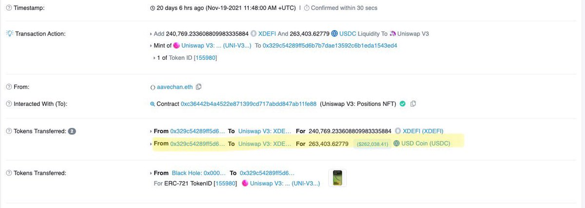 4/ However that same day he added liquidity (USDC/XDEFI) with all 240k tokens on Uni V3 and proceeded to dump it all hours later for a nice $418k profit.