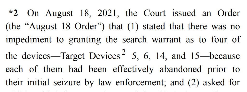 For the remaining phones, Judge Harvey engages in an analysis that is sort of an ex parte reconstruction of issues that you might imagine a defense counsel to argue in a hypothetical motion to suppress, assuming the searches go as planned.