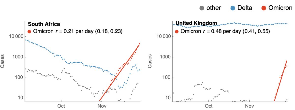As before, we partition case counts from @OurWorldInData using sequences from @GISAID into estimated Omicron, Delta and other cases, and we use this partitioning to infer variant-specific Rt and epidemic growth rate r (methods and code here github.com/blab/rt-from-f…). 2/10