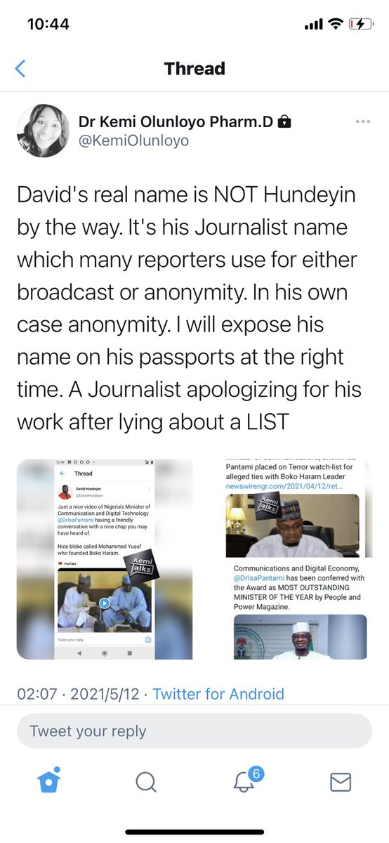 This is a woman who came here and publicly claimed that David Hundeyin is an alias, not my real name. Then when I showed evidence that she was hallucinating as usual, she deleted the tweet.