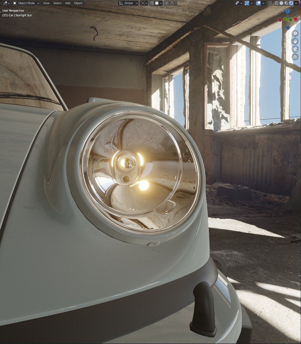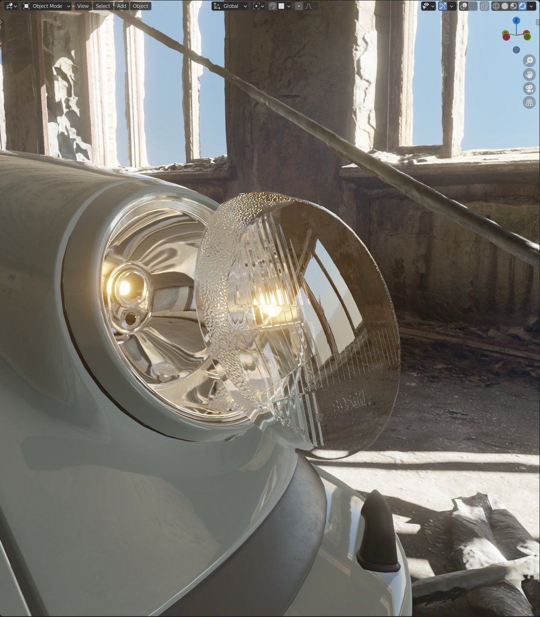 And here's why an accurate model with a nice topology is important. I put a 50-watt "bulb" where it should be in reality. Viewed off-axis, the headlight barely is shining, but once I look head-on, the light is very concentrated. Really cool to see it work in Blender so well!