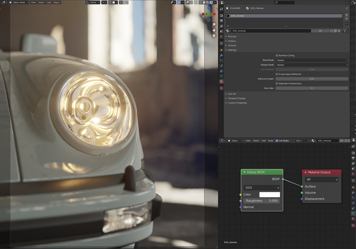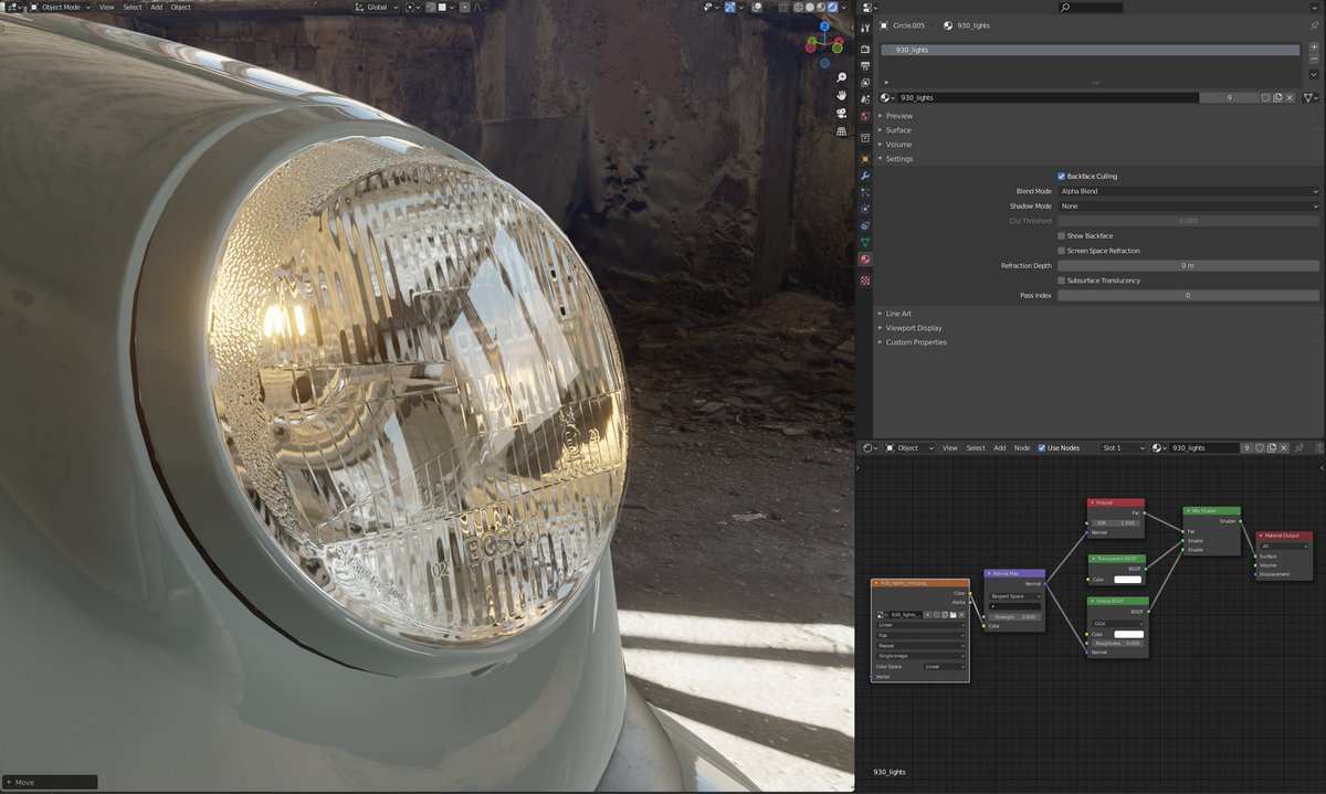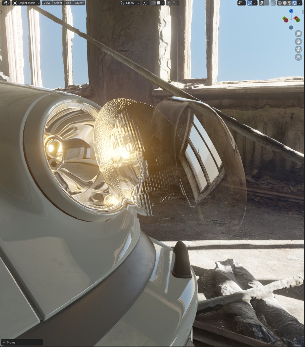 Physically-based car headlights in Blender. This method is made for Eevee because refraction and reflections in a single material do not interact nicely.