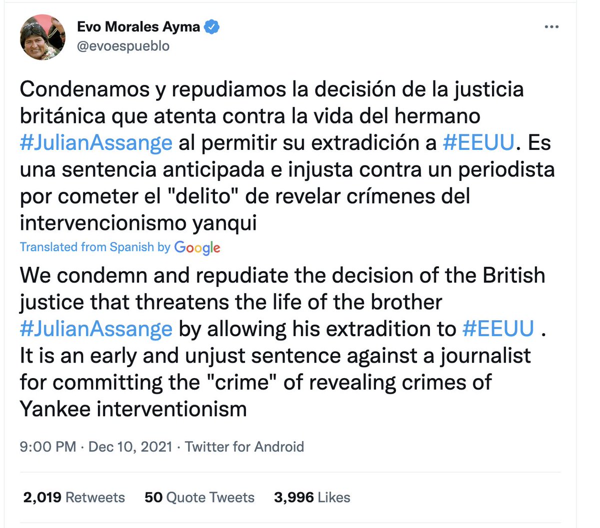 Add former 3-term Bolivian President Evo Morales to the long list of world leaders from across the spectrum vehemently denouncing the US/UK's attempt to punish a journalist with imprisonment, and heralding Assange's work as what it is: heroic.
