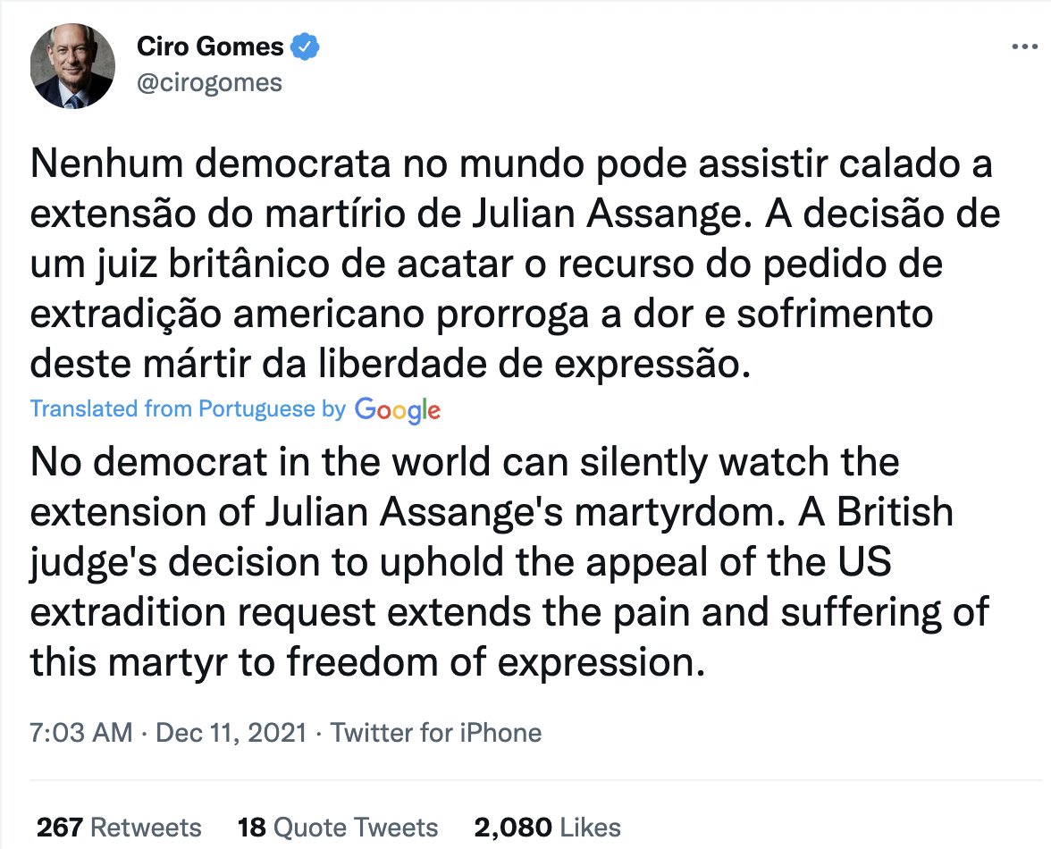 Yesterday I posted the video of Lula heralding Assange as a hero and denouncing the US/UK as tyrannical. Here's another center-left presidential candidate from Brazil, @cirogomes, arguing the same.