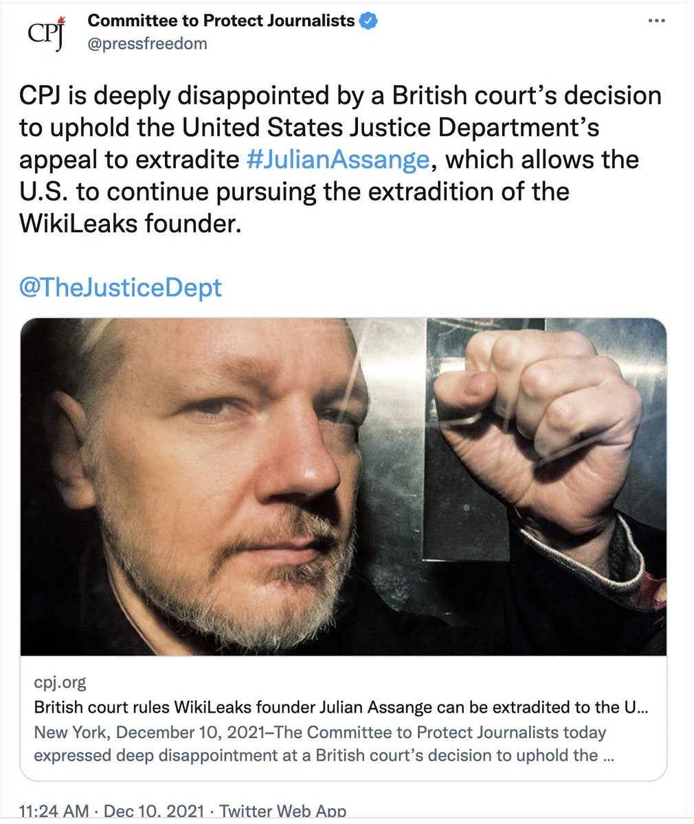 The Committee to Protest Journalists issued a statement early this morning warning that the UK judicial ruling and Biden DOJ's attempt to extradite Assange "seriously damages journalism":