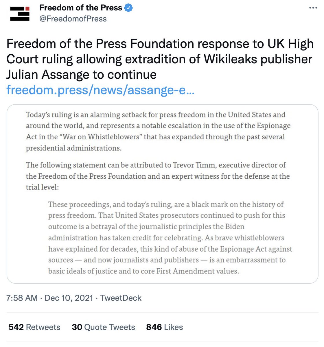 We now have a strong denunciation from the @ACLU on their Twitter feed of the Biden DOJ's "victory" in a UK court for its ongoing authoritarian attempt to extradite and prosecute Julian Assange as punishment for the reporting he did: