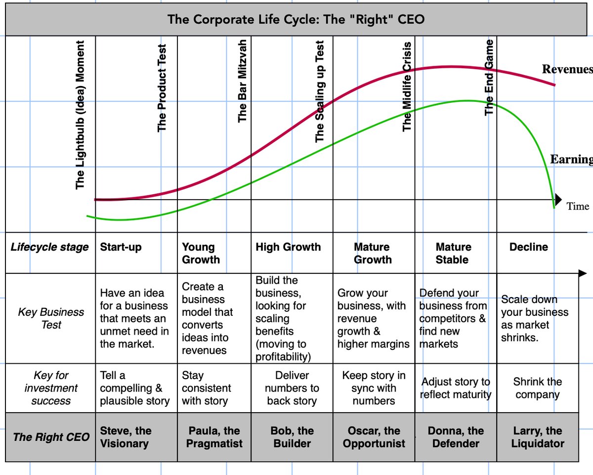 In my opinion, the right CEO for a company reflects where it falls in the corporate life cycle. Young companies need visionaries, growth companies benefit from builders, mature companies crave defenders and declining companies are best run by liquidators. bit.ly/3pKxFQ8