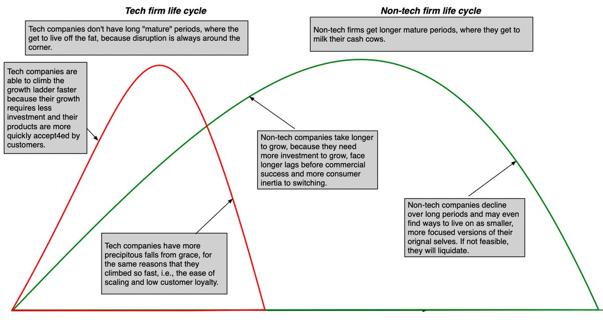 The tech revolution in markets has created companies that age in dog years, with a 20-year tech company resembling a century-old manufacturing firm. Tech companies grow fast, don't stay at the top long and decline just as fast. bit.ly/3pKxFQ8