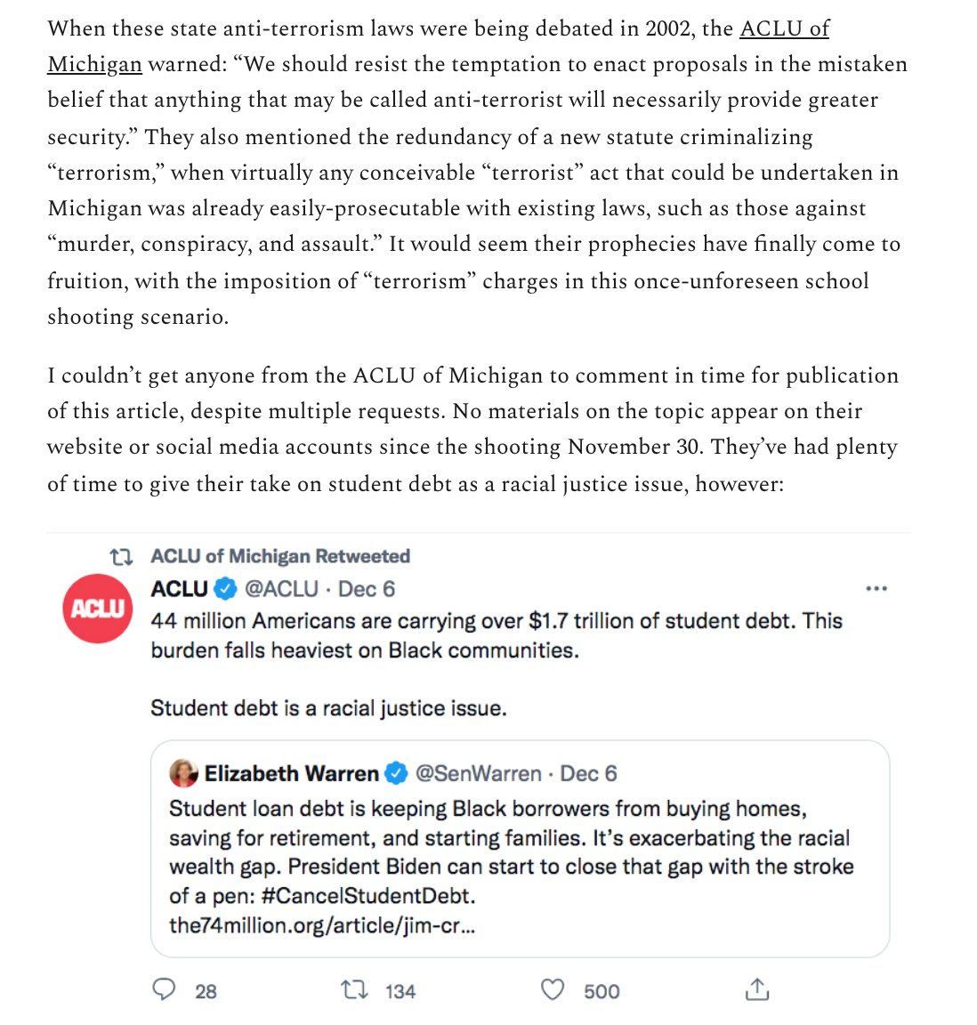 Michigan rushed to enact a "terrorism" law after 9/11, supposedly to protect the state against Al Qaeda. 20 years later, that same law is being used to charge a 15-year-old school shooter who expressed no apparent political motive, under the auspices of "progressive prosecution"