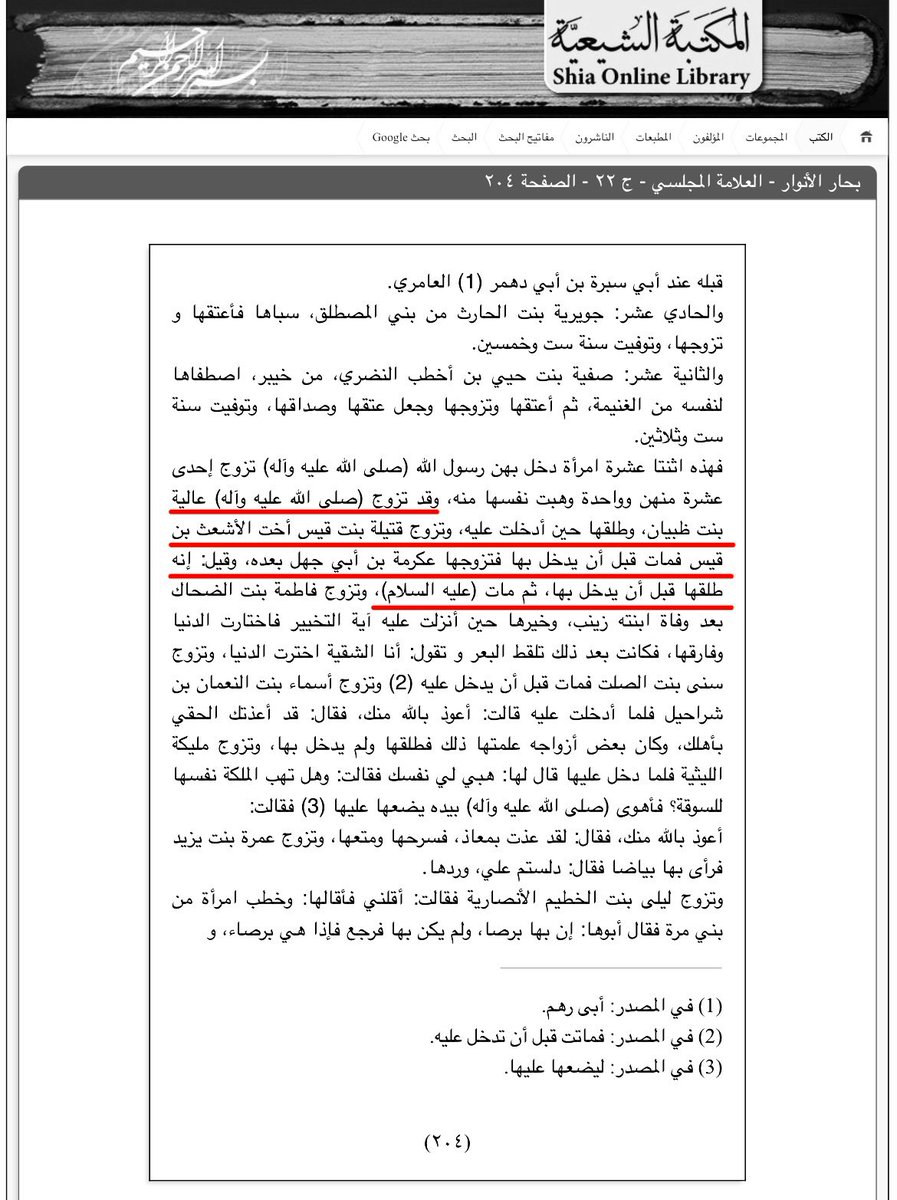 And according to Muhammad Baqir al-Majlissi (shia rabbi) the Prophet ﷺ divorced Qutayla Bint Qayss and also divorced ‘Aliya Bint Dhabyan.