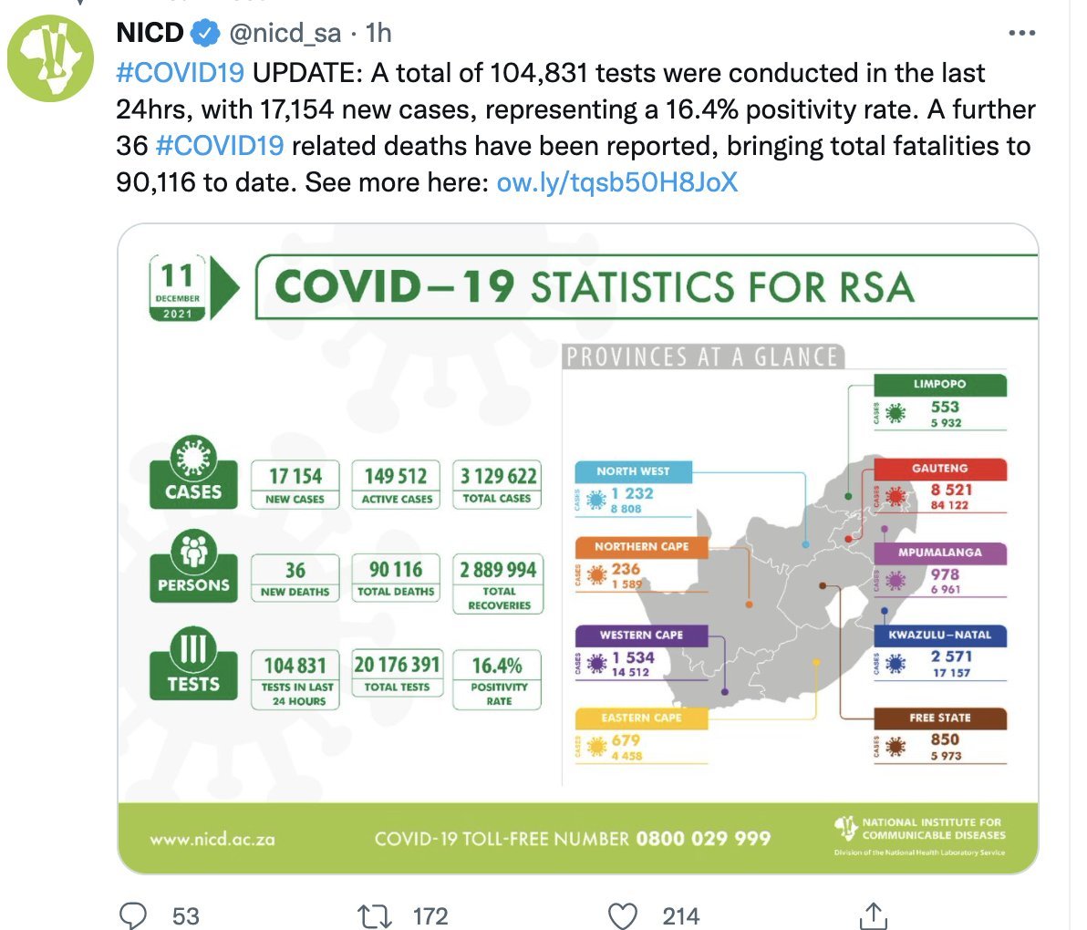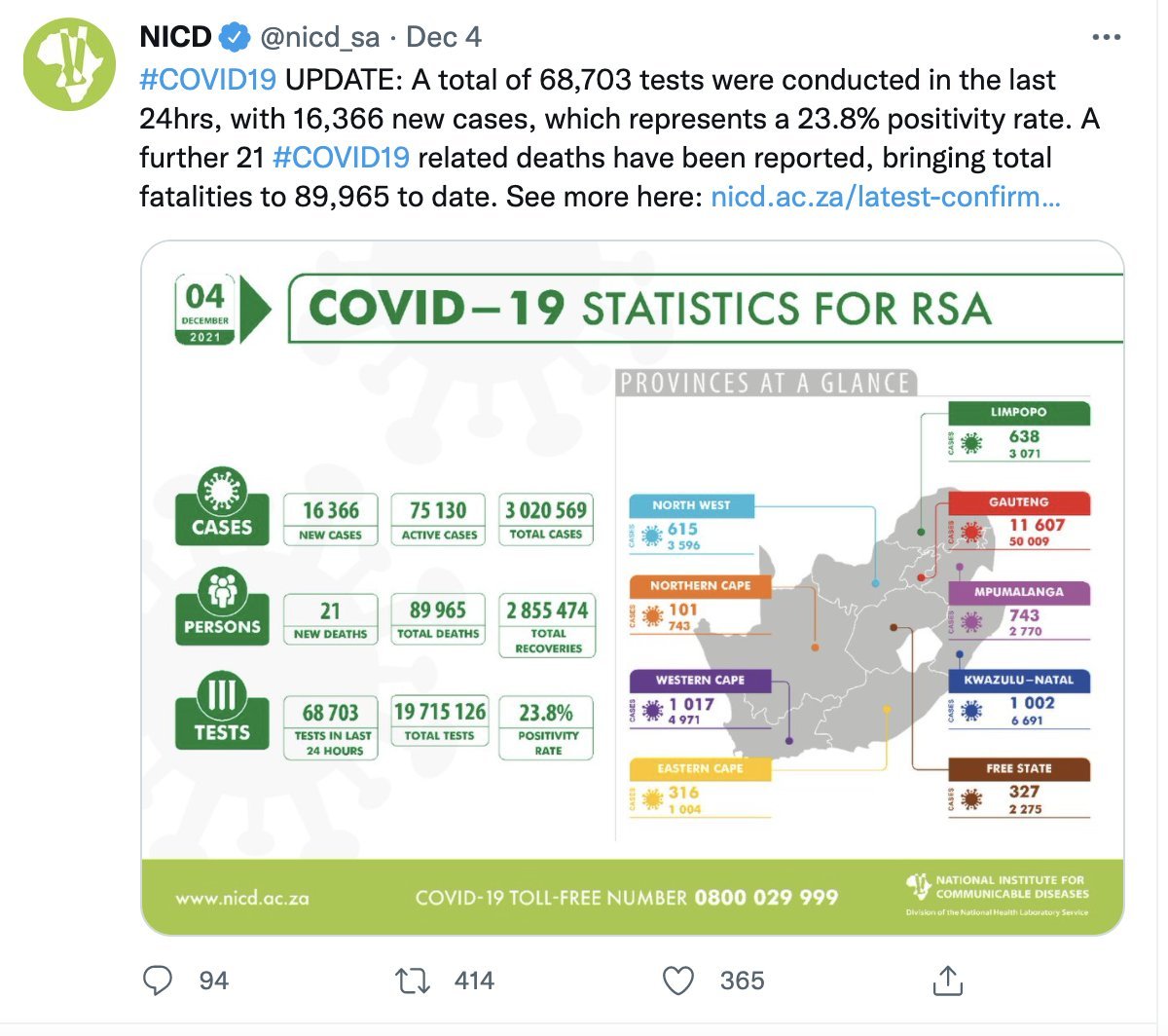 Also notice the week-over-week change in different provinces. Gauteng and neighboring provinces look like they have peaked. Farther afield provinces (Western Cape, Eastern Cape) are still rising. Which makes sense as Omicron spreads nationwide. It does not look like a data error.