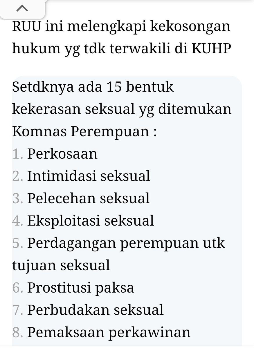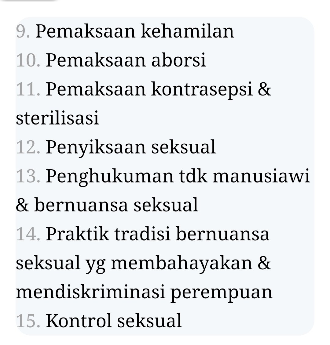 Di draft yg baru, bentuk kekerasan seksual : 1. Pelecehan seks 2. Pemaksaan alat kontrasepsi 3. Pemaksaan hub seks 4. Eksploitasi seks