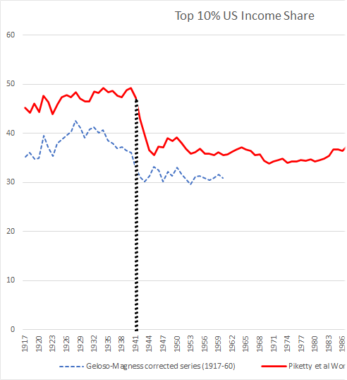 In reality, the Piketty series' depicted WWII drop (1941-45) is almost entirely a statistical relic of unaccounted for changes in IRS data reporting + Piketty's failure to reconcile his denominator to IRS accounting.