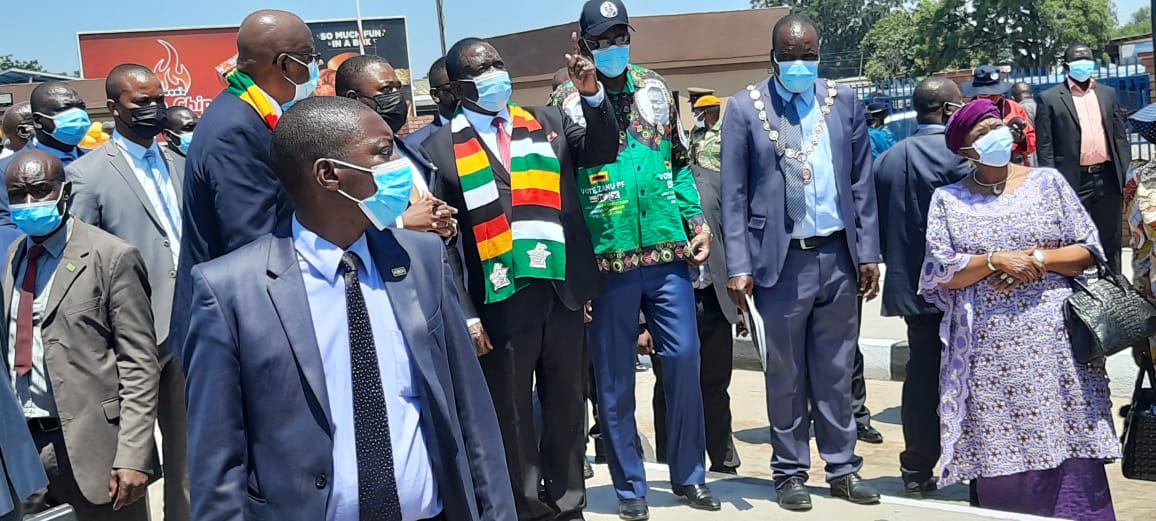 President Mnangagwa arrives for the official oppening of the State of the Art Kudzanayi Terminus in Gweru. The President is accompanied by the Minister of Women Affairs, Community,Small to Medium Enterprises, Sithembiso Nyoni and several senior Govt officials