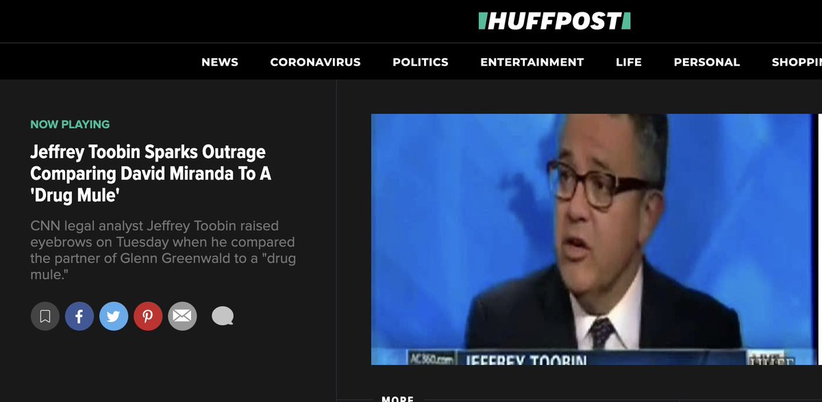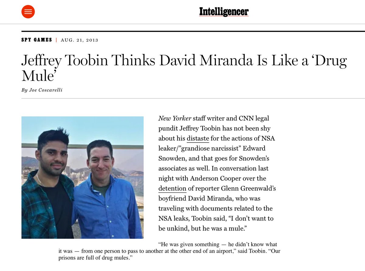 Given the latest outbreak on the liberal-left of all the standard homophobic and racist tropes about @davidmirandario - he's just a dumb, manipulated boy - this was begun by @JeffreyToobin on CNN during the Snowden reporting, repeatedly calling David an empty-headed drug "mule."