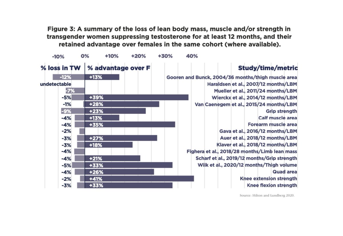 2| Besonders kontrovers: Transfrauen im Leistungssport. Welche Vorteile eines männlichen Körpers behält eine Person, die als Mann erwachsen geworden ist und dann dank Testosteronsuppression Zugang zu Frauenwettbewerben erhält? Auch hierzu ein paar Daten: sehr erhebliche Vorteile.
