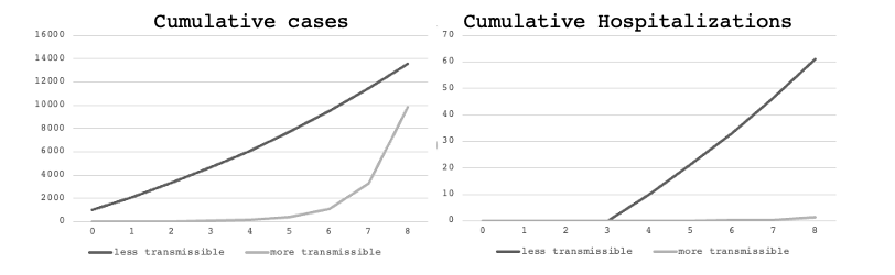 Now assume the sickest people only get hospitalized 4 generations after they are infected. Almost all the hospitalizations we we see are with the less transmissible variant. The hospitalizations from the more transmissible have not yet started to increase rapidly 5/n