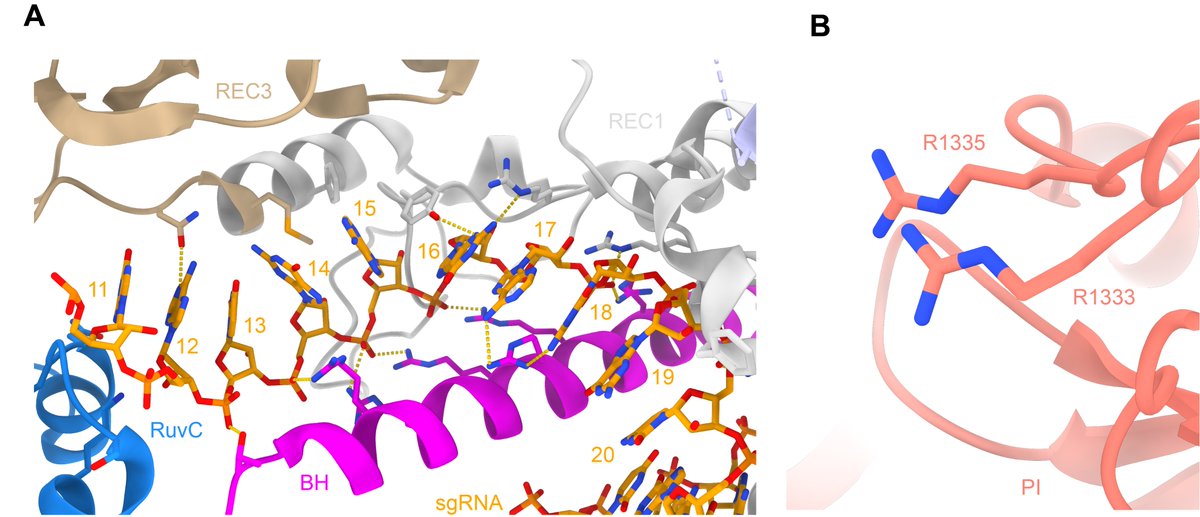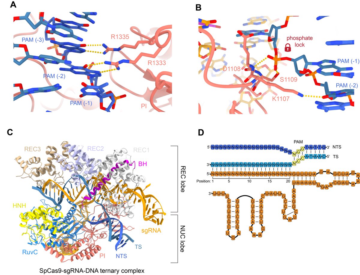 Here I highlight the structural preordering of the guide RNA seed region in a pseudohelical arrangement (A) and the PAM-interacting residues in the binary complex. Both of these significantly increase the efficiency of target sampling and binding. PDB: 4ZT0