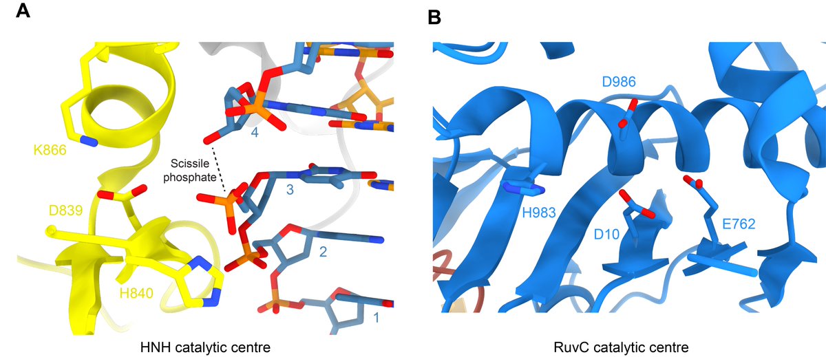 Lastly we have the renderings of the HNH and RuvC nuclease sites and active residues. PDBs: 6O0Y, 4UN3