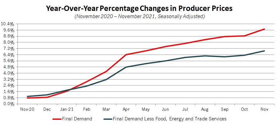 Over the past 12 months, producer prices for final demand goods and services jumped 9.7% (seasonally adjusted), up from 8.8% in October and the largest increase on record for a series dating to November 2009. (The non-seasonally adjusted figure was 9.6%.)