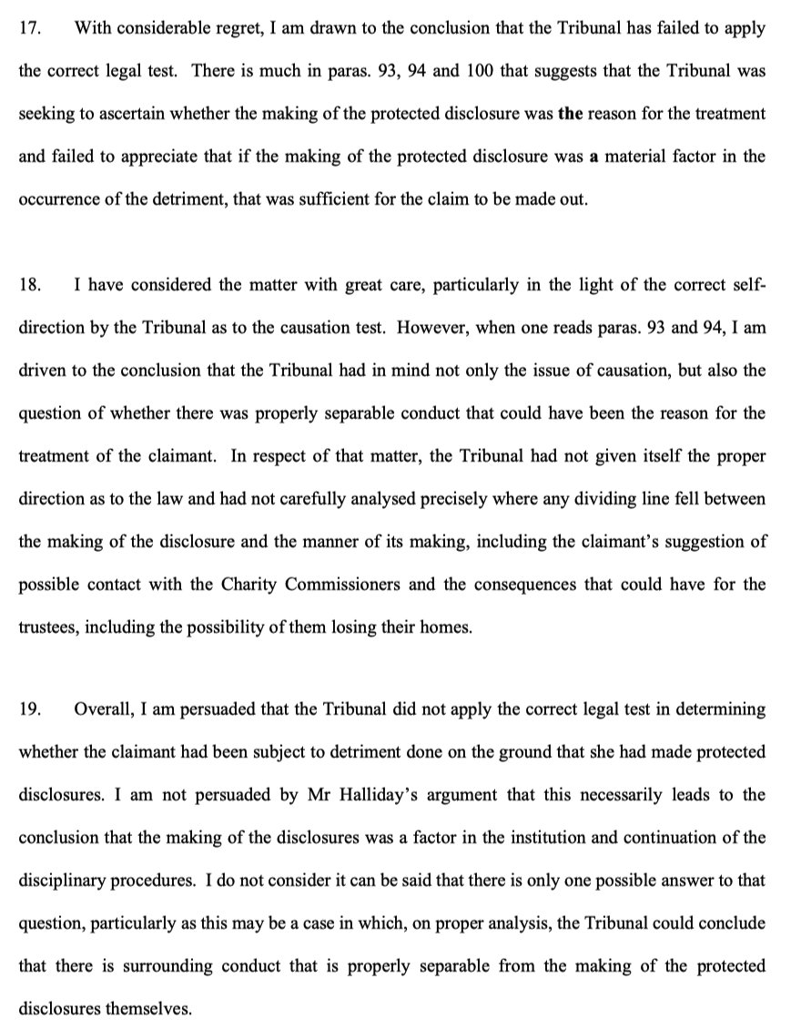 1/ Fitzmaurice v Luton Irish Forum: EAT finding that the ET erred in applying the causative test in a s.47B detriment claim by looking for the reason for detriment rather than material factors influencing the doing of the detrimental act. bailii.org/uk/cases/UKEAT… #ukemplaw