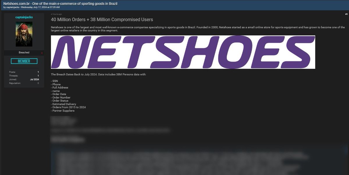 De acordo com publicação no fórum cibercriminoso BreachForums, cerca de 38 milhões de usuários registrados foram expostos, ao lado informações sobre 40 milhões de registros de compras