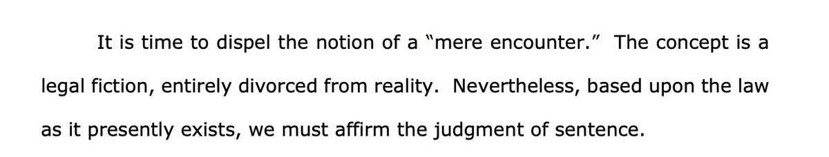 Judge Musmanno really doesn't like the Supreme Court's "voluntary encounter" caselaw. (An alternative would be to say it's a compelled encounter but is allowed with no cause. But from a civil liberties perspective, isn't that worse?) pacourts.us/assets/opinion…