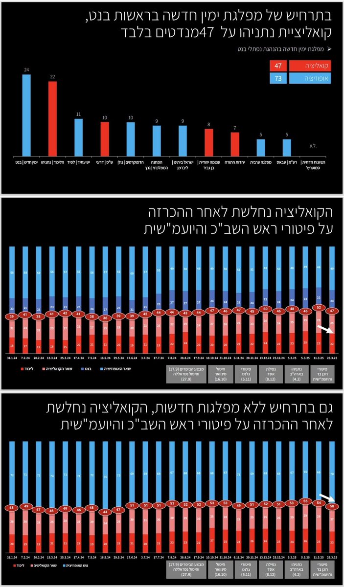 3. מה שיכול להפיל ממשלה, זו התרסקות פנימית או קריסה בשל חילוקי דעות או כשלון מחפיר ומדיניות כושלת. אבל בגדול, ממשלות בישראל לא מופלות מבחוץ. הן נופלות או מפילות את עצמן. לאופוזיציה של 56 אין ממש יכולת להפיל קואליציה של 64. זו עובדה. לא משנה כמה טנטרום יהיה בטוויטר