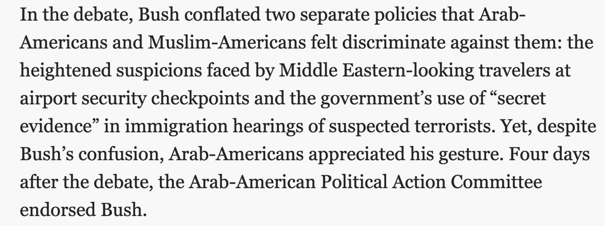 "Bush said during the nationally televised debate, "Arab-Americans are racially profiled in what’s called secret evidence. People are stopped, and we got to do something about that. ... So racial profiling isn’t just an issue at the local police forces."