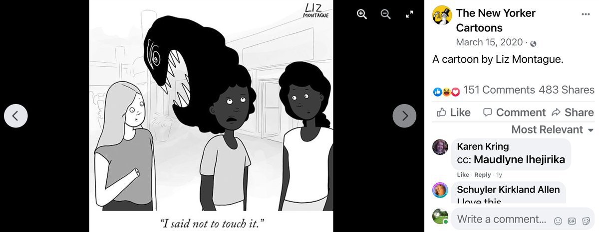 Washington Post: Black woman "New Yorker" cartoonist boldly goes where no "New Yorker" cartoon has gone before, proving how essential diversity is to humor by bravely referencing the Great Hair-Touching Crisis: