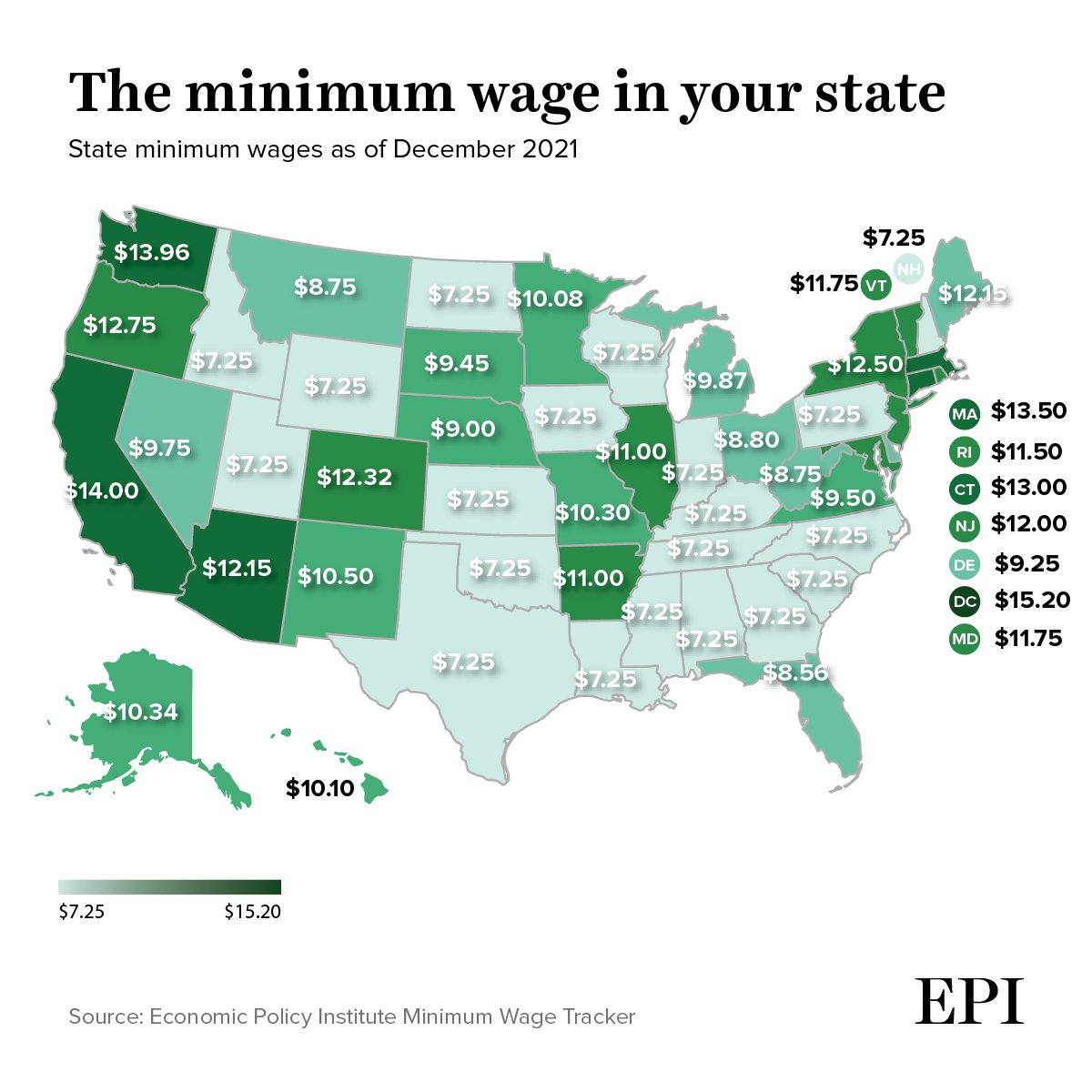 The 17 U.S. states with the highest union densities have state minimum wages that are on average 19% higher than the national average and 40% higher than those in low-union-density states.