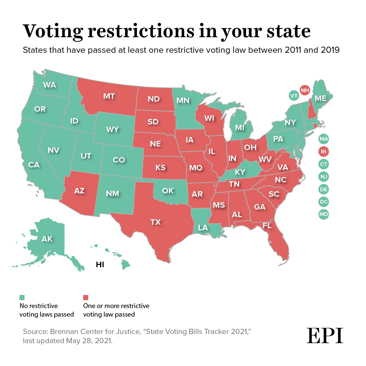 A majority of low- and medium-union-density states have passed at least one voter restriction bill, while the vast majority of high-union-density states have passed none.
