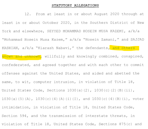 First off, the Defendants are two Iranian Nationals. Which is somewhat disappointing, since we all want to get to the goldurn Enemies Domestic we all know are out there, but there's at least a hint her about them.