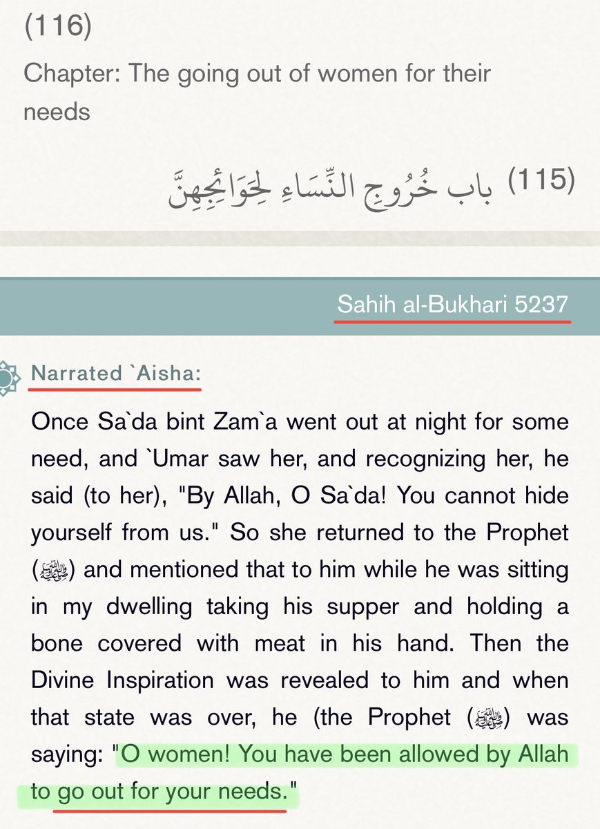 The Messenger of Allah ﷺ said: “O women! You have been allowed by Allah to go out for your needs.” - (Sahih al-Bukhari, vol. 7, p. 38, h. 5237).