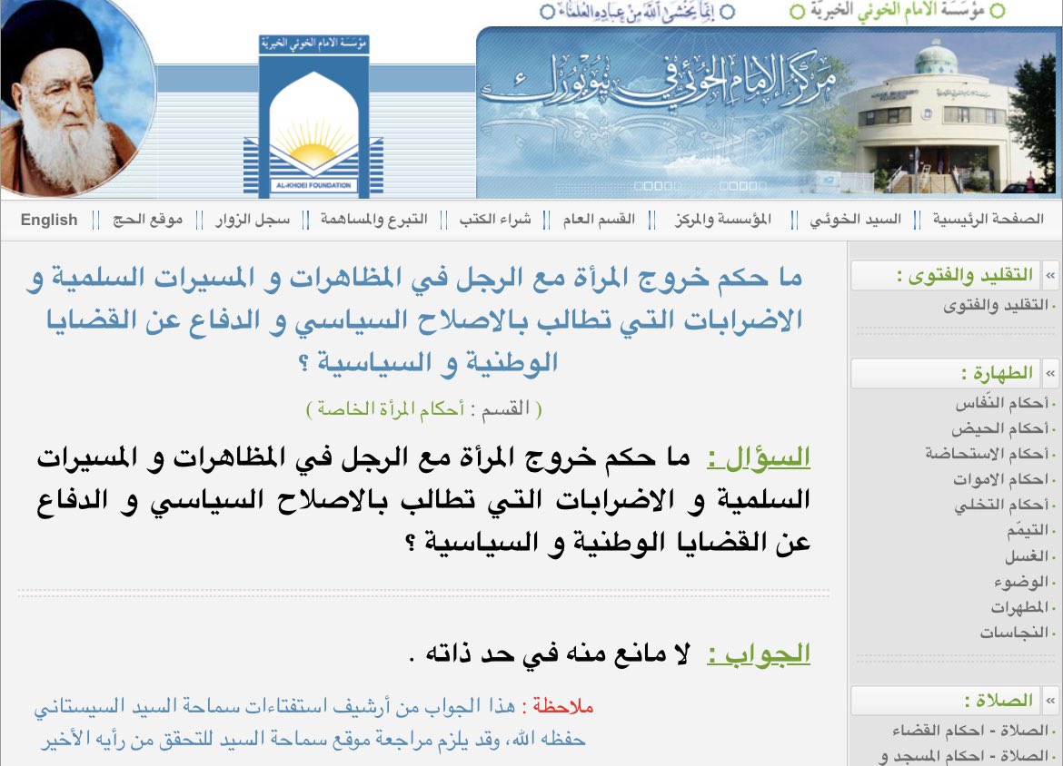 In another setting, Ayatollah al-Khoei was asked if it’s permissible for a woman to go out and free-mix with men in political protests and he said that there is nothing wrong with it.