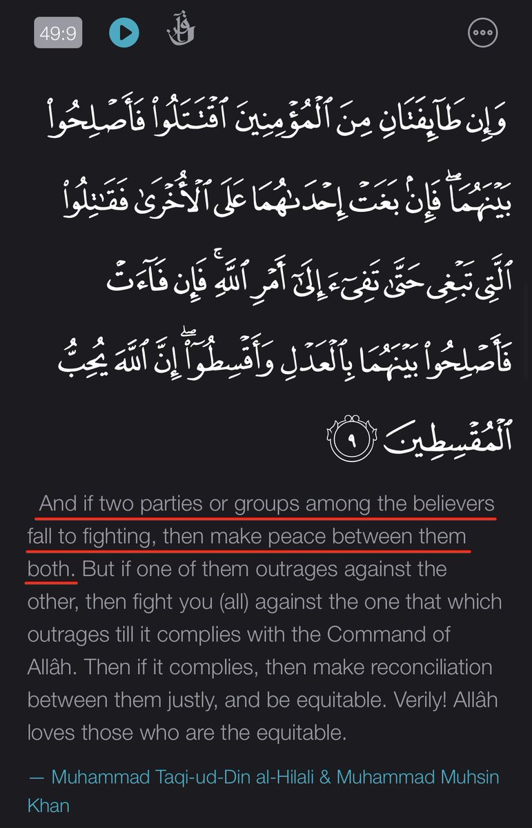 Allah said: “And if two parties or groups among the believers fall to fighting, then make peace between them both.” - (49:9).