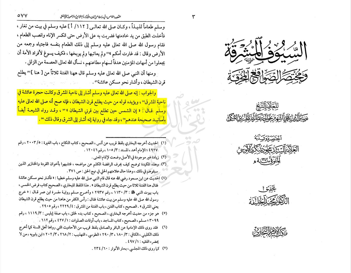 “He (peace be upon him) point to the direction of the east and the house of 'Aisha in the direction of the east. And this is supported by his saying [i.e. the Prophet]: «The rises between the horns of the devil». And the Shia have narrated this as well with authentic chains and it was mentioned in a narration that he said it whilst pointing at the east”.