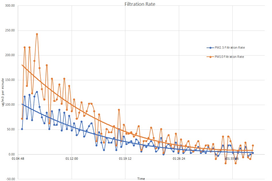 Now to plot the graphs of the air-quality meter readings. Plotted is the whole test cycle and also the start phase and the air-filtering phase.