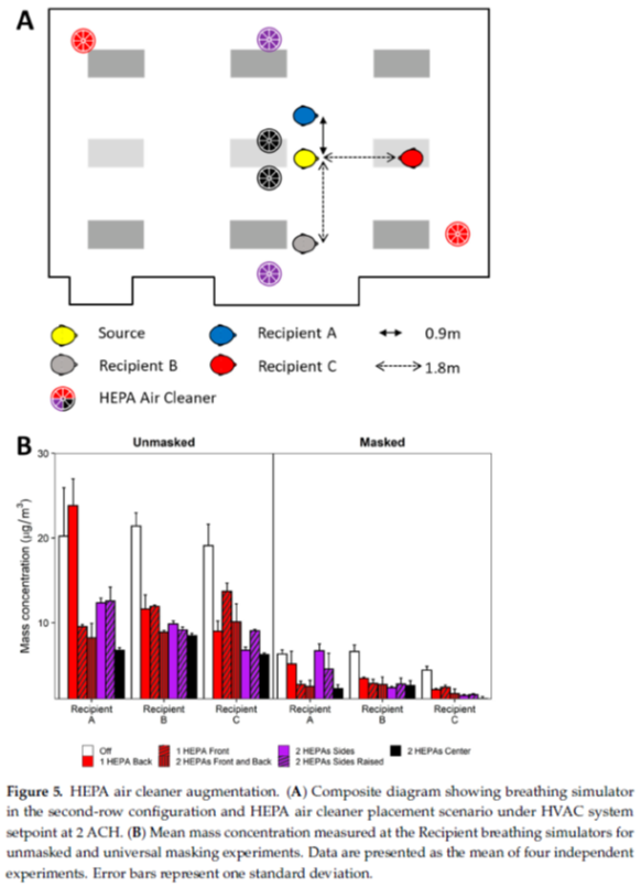 7/ Adding 1 or 2 HEPA air cleaners around the room at several locations (when HVAC at 2 ACH) also reduced exposure, whether participants masked or not. Putting HEPAs in center (black bars) reduced exposure the most.