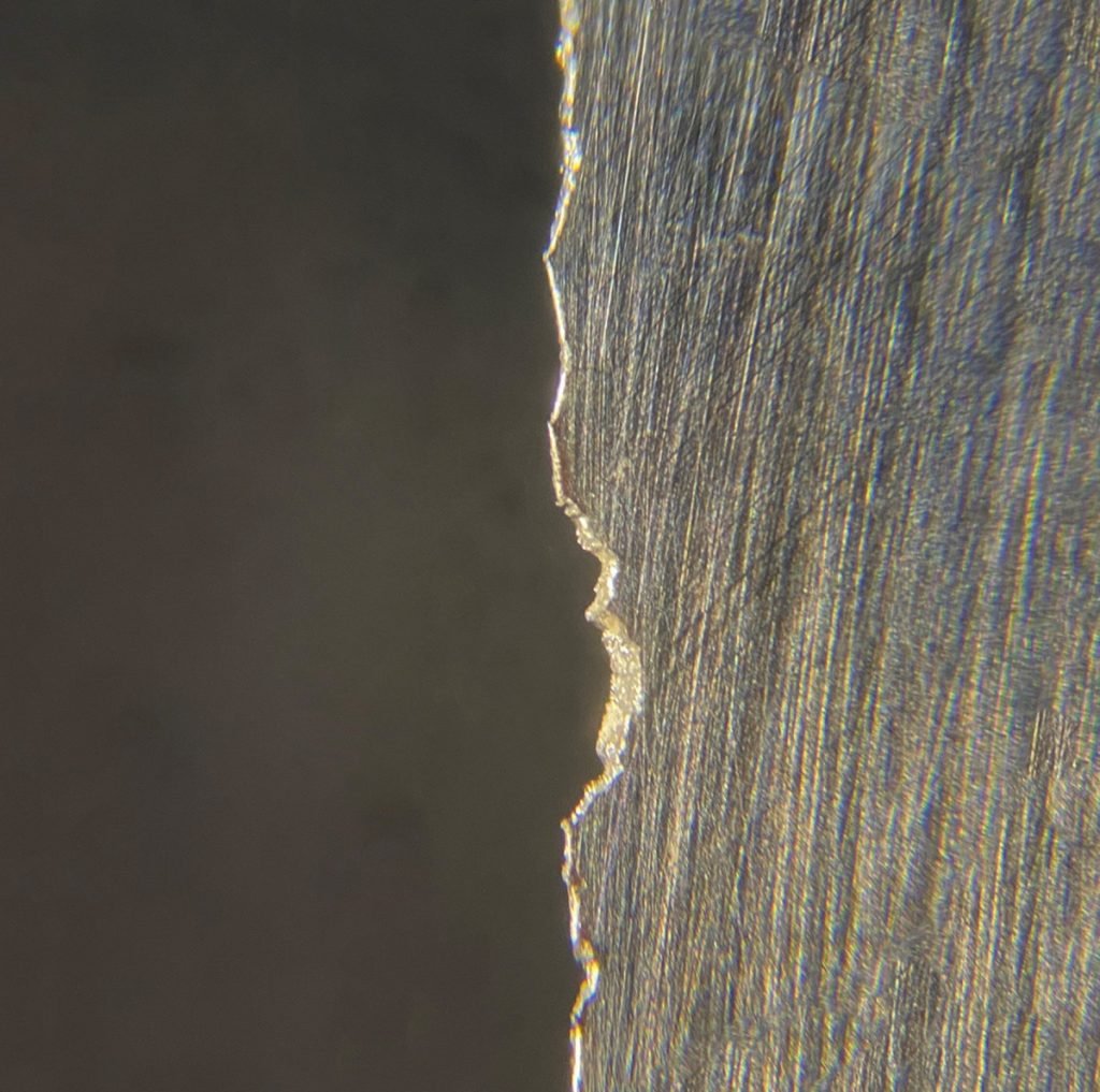 quando o lado do fio que você está desgastando encostar no outro lado do fio se formará uma rebarba neste outro lado, como mostrado na foto de miscroscópio abaixo: