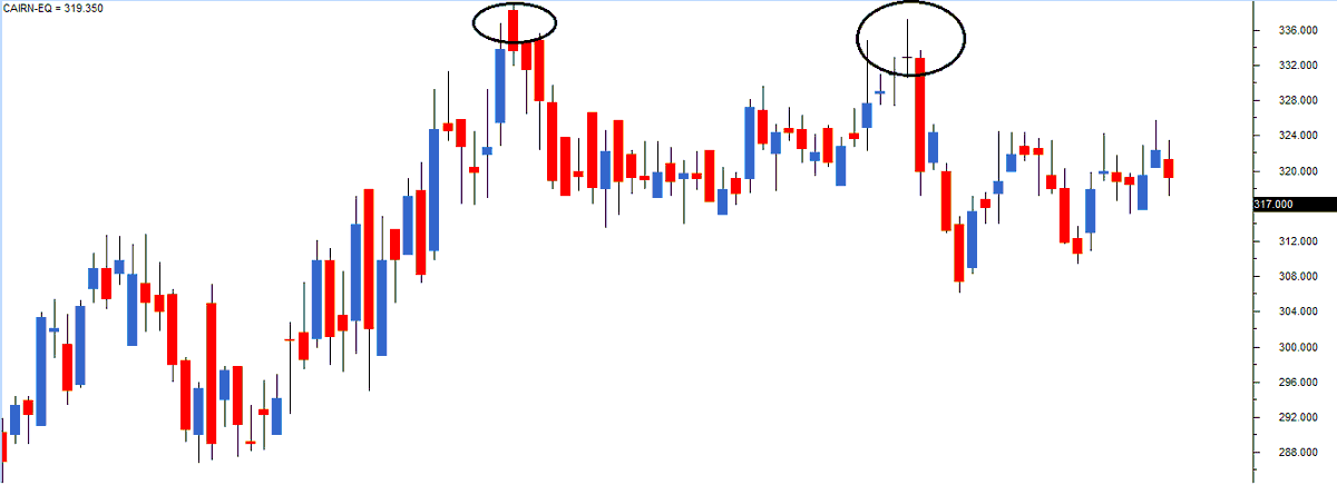 In chart below (Cairn India Ltd), we can notice the double top at 336 levels. On close observation, u will notice the first top was around Rs.336, and the second top was around Rs.332. With some amount of flexibility, a small difference such as this should be considered alright.
