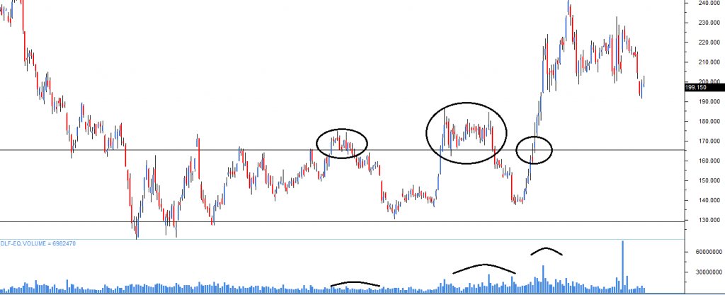 The following chart shows a triple top formation for DLF Limited. Notice the sharp sell-off after testing the price level for the 3rd time, thus completing the triple top.