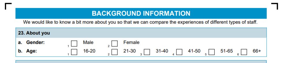 1/ 2021 NHS Staff Survey. It is a basic principle of questionnaire design that when you expect the respondent to pick one option, the responses must be mutually exclusive. People who identify as non-binary are also male or female. And why can you self-describe sex but not age?