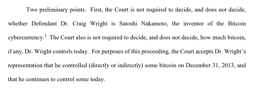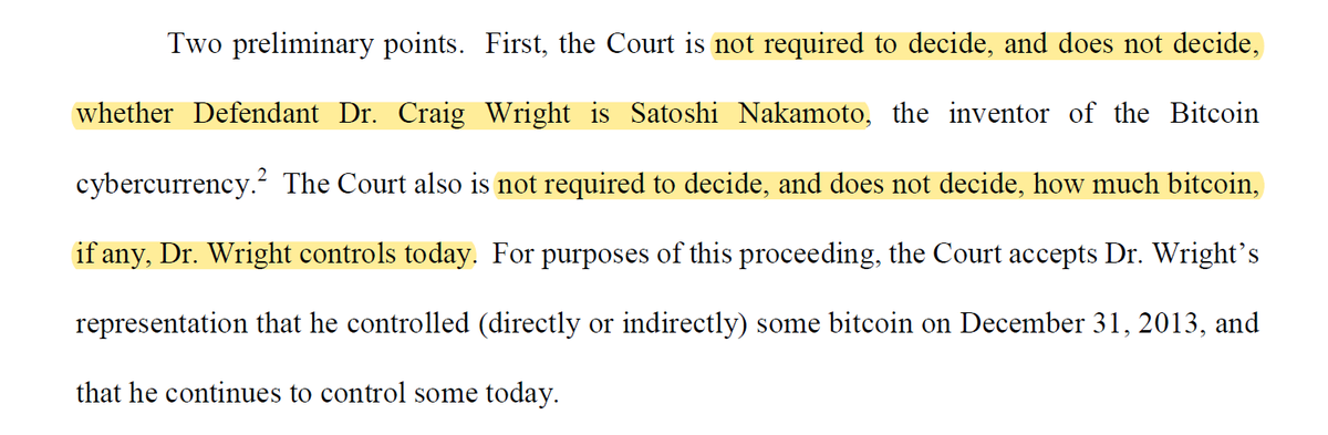From the very beginning the judge makes it clear that he is NOT deciding on whether CSW is Satoshi Nakamoto. CSW and his fans have already repeatedly lied about this since the ruling.