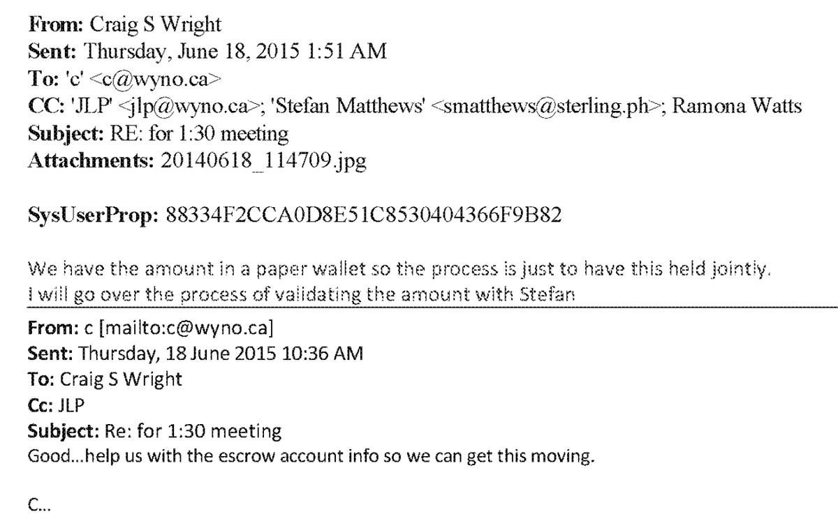 Following up on this claim, Wright was showing around the following printed paper wallet circa mid-2015, seemingly in order to convince potential bailout investor Calvin Ayre that Wright's claimed Bitcoin holdings were real.